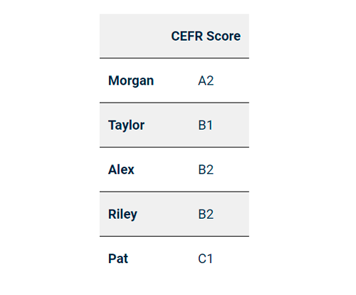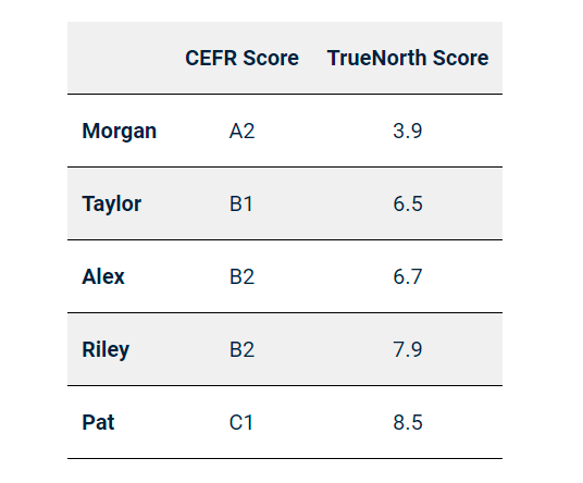 Nossos testes de proficiência são sustentados por dados. Nossa missão com esse produto é fechar a lacuna de comunicação global. Um dos principais métodos para fazer isso é fornecer dados acionáveis aos nossos clientes. No aprendizado e recrutamento de idiomas, nenhum dado é mais crucial do que a pontuação de proficiência de um candidato. Ao utilizar nossos teste de proficiência baseados na inteligência artificial, nossos clientes economizam tempo e dinheiro, ao mesmo tempo que são mais precisos e consistentes na avaliação da habilidade do idioma candidato. Padrões Globais Atuais para Pontuação de Idiomas Existem muitas escalas de linguagem padrão usadas em todo o mundo. Alguns deles são usados mais predominantemente em determinadas regiões geográficas ou indústrias. As escalas mais comuns são CEFR, ACTFL e ILR, embora existam muitas outras. Há empresas e escolas de idiomas que desenvolvem seu próprio sistema de classificação interno personalizado ou escala para avaliar a habilidade do idioma. O problema com as escalas padrão, e geralmente as escalas personalizadas, é que elas fornecem apenas uma medida de habilidade em 5, 6 ou 7 níveis. O Quadro Europeu Comum de Referência para Línguas (CEFR) é a escala mais comumente usada internacionalmente para fins de recrutamento. O CEFR é uma ferramenta muito útil que oferece seis níveis de proficiência, do iniciante ao domínio: A1, A2, B1, B2, C1 e C2. É difícil para um ser humano que está avaliando a capacidade de outro indivíduo de falar e compreender um idioma ser acertivo. Os benefícios da pontuação baseada em IA Como o Ia Agile utiliza um sistema dirigido por IA para fornecer pontuação automática de proficiência em linguagem, podemos ser muito mais precisos em nossa pontuação de capacidade de linguagem do que um avaliador humano. Nossa escala da TrueNorth fornece 100 pontos exclusivos de medição de proficiência no idioma, ao mesmo tempo em que fornece a comparação com o CEFR, ACTFL e muitas outras escalas, se necessário. Aqui estão quatro benefícios que a escala TrueNorth oferece em comparação com outras escalas de idioma: 1. Mais dados acionáveis. Imagine que você tenha cinco candidatos que se candidataram ao seu programa de idiomas ou a uma oportunidade de emprego. Eles são avaliados por sua proficiência oral e receberam os seguintes resultados na escala CEFR, classificados de iniciante a avançado por um avaliador humano.